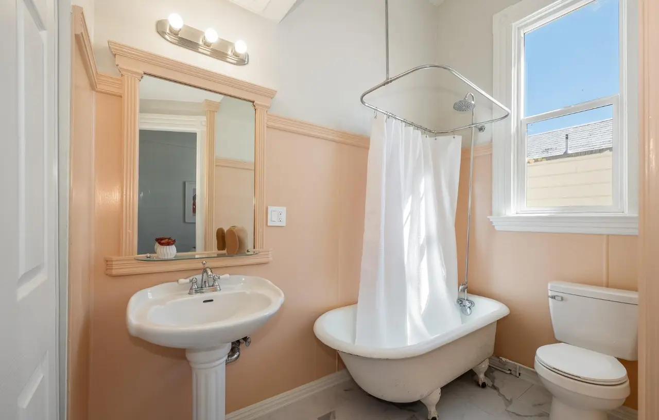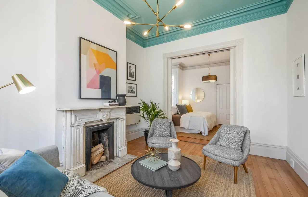 “The biggest upgrade was the downstairs unit bathroom, which was a complete gut remodel. The rest was mostly cosmetic. We were working within a tight budget so I opted to repaint the cabinets instead of totally replacing, glazed the existing tile countertop, and added new features like the appliances, heaters, lighting, and flooring. Also, due to the smaller budget, I opted to go bold with pops of color to bring the Victorian footprint of the house to life and create depth and eye catching elements. The home already had stunning fireplaces with hand carved marble flowers and 11ft high ceilings, so we focused on fixing the plaster details to make the character shine.”