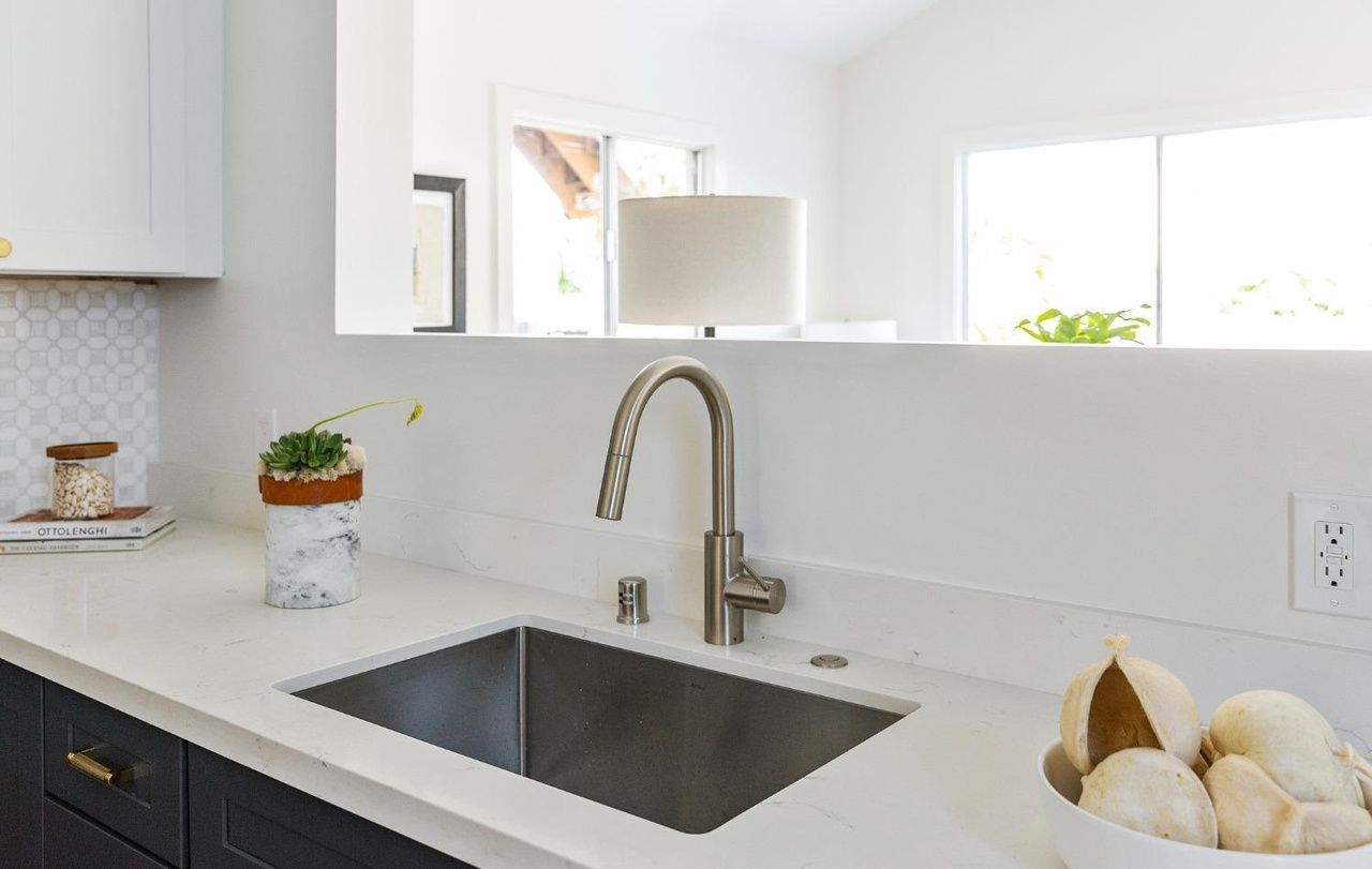 When looking to make improvements in the kitchen, Megan directed her team to remove all of the existing cabinets, countertops, and appliances to make space for more updated fixtures to be installed. The drywall throughout the room was repaired and prepped for painting, and new cabinets and hardware were installed. A new under-mount sink and faucet were added, and the refrigerator was moved to a new location to best maximize the use of the space. A new range and microwave were installed, along with a fresh tile backsplash. A new dishwasher was also added and the kitchen closet was demolished in order to create more space for a kitchen table.