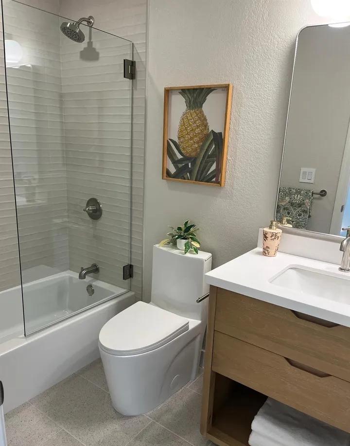 - Primary Bathroom: Installed vanity lights, changed bathtub to shower and framed shower curb, removed medicine cabinet and patched the wall, installed prefab niche, installed fixed shower head, tub filler, temp valve, volume valve and drain, installed tile floor, installed tile walls, installed tile niche, installed extraction fan, installed toilet, installed prefab vanity cabinet, counter & sink, installed sink faucet, installed vanity mirror, installed toilet paper holder, robe hook, towel bar & towel ring