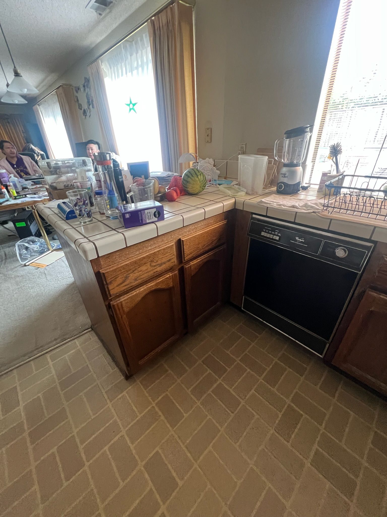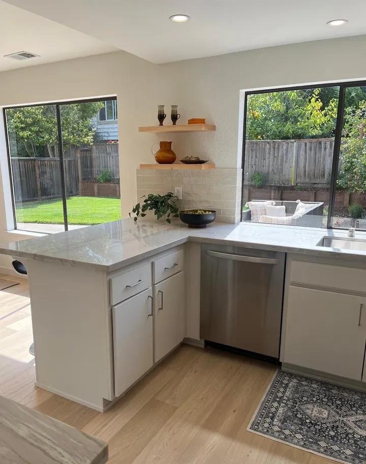 - Kitchen: Painted cabinets, installed cabinet hardware, installed faucet, installed disposal and air switch, installed countertops and sink, installed backsplash, installed range, installed microwave hood, installed refrigerator, installed dishwasher, removed linoleum, replaced kitchen ceiling light with retrofit, replaced kitchen seating pendant