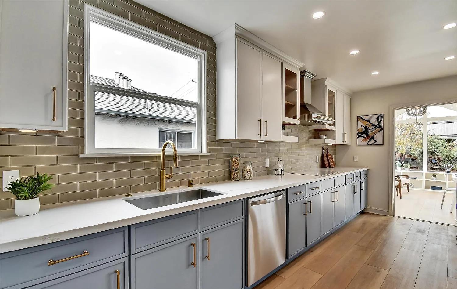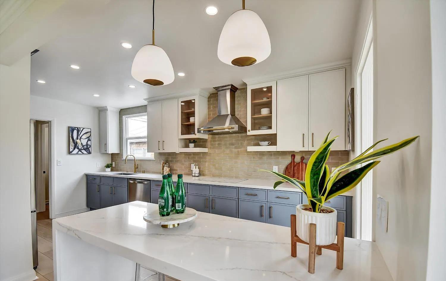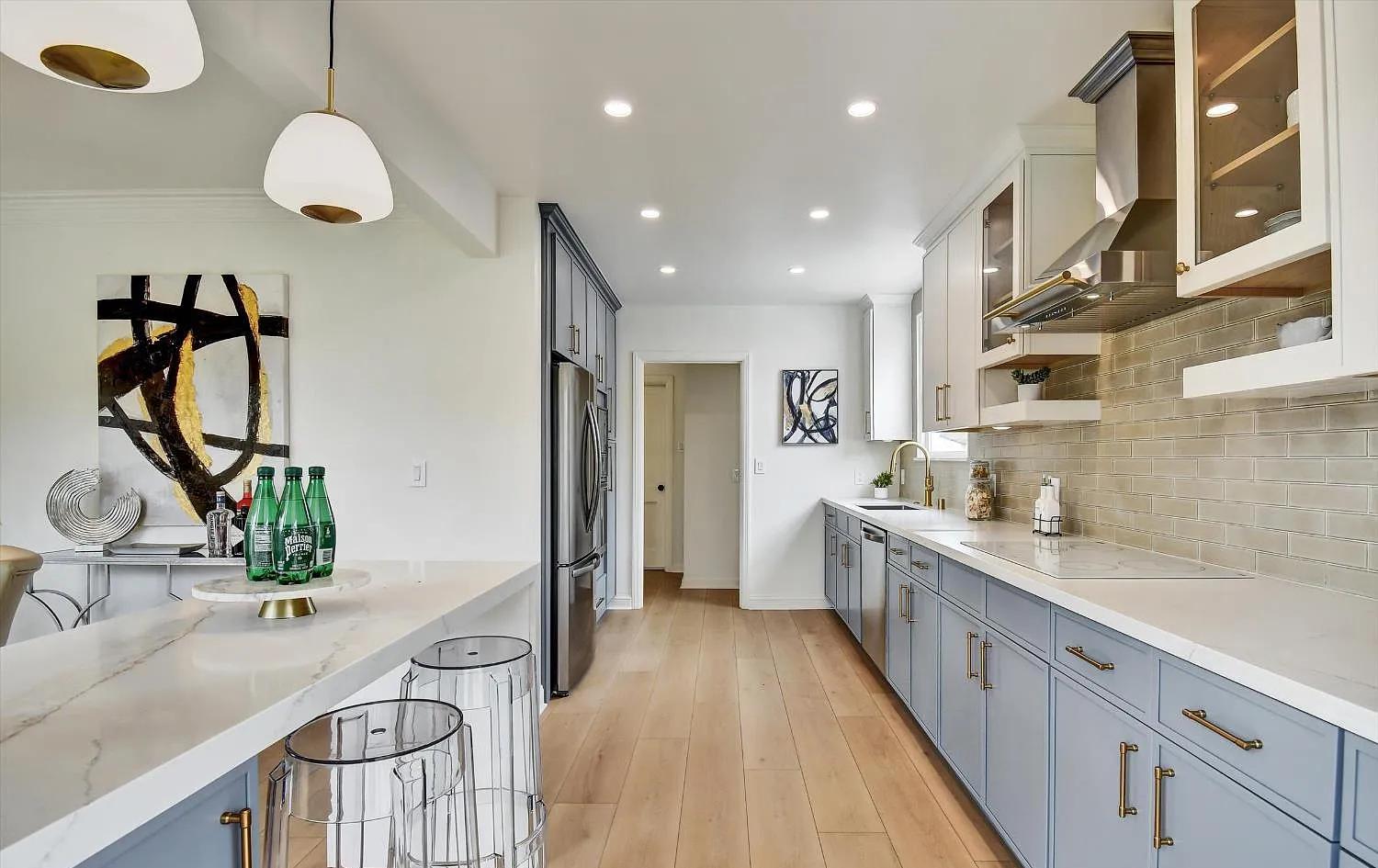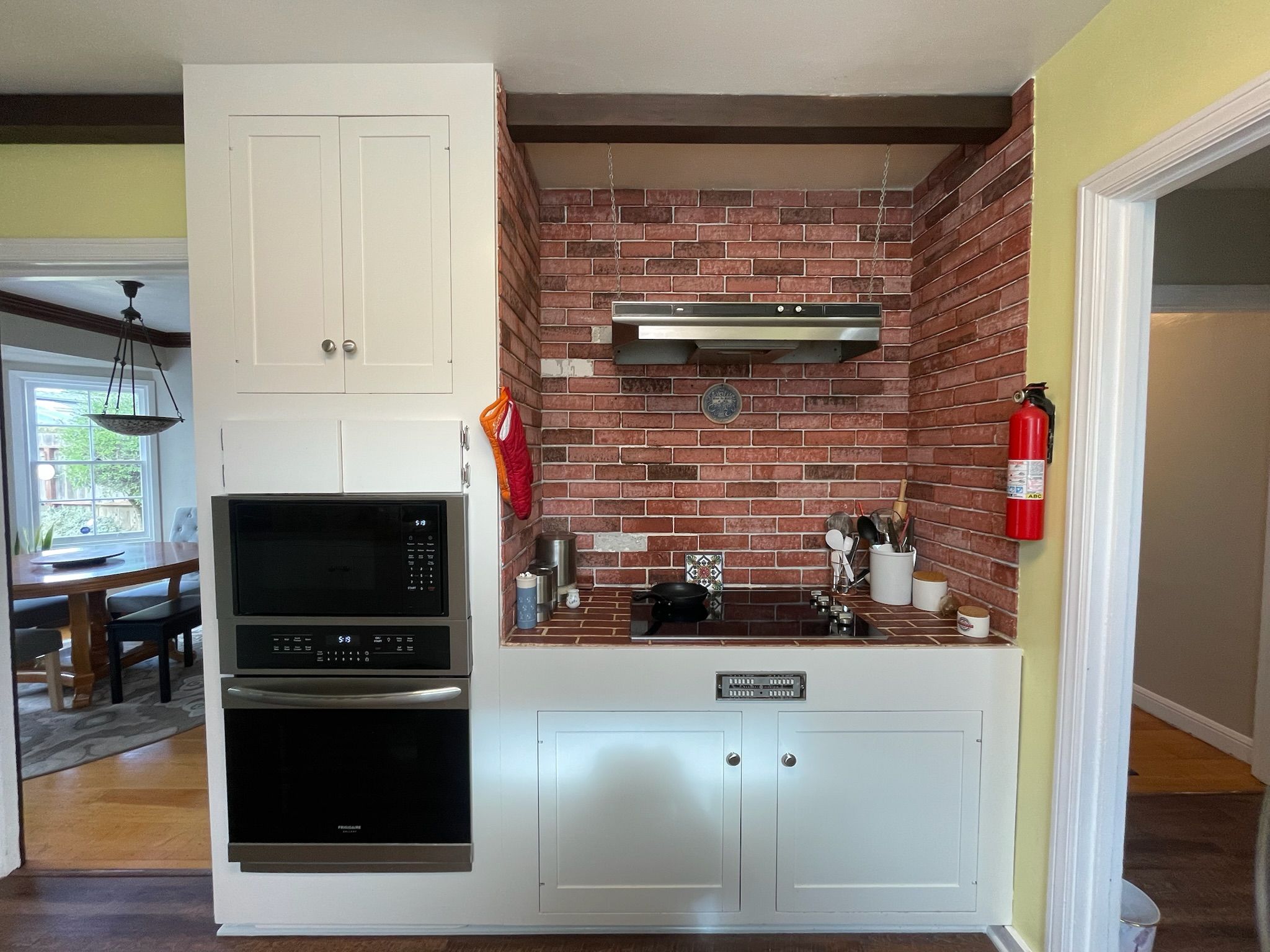 - Kitchen: Installed recessed lights, installed sub panel, installed new circuit for recessed lighting, installed new circuit for refrigerator, garbage disposal, dishwasher & range hood, installed pendant light, installed new cabinets & hardware, installed undermount sink & faucet, installed garbage disposal, installed countertop substrate, installed peninsula countertop, installed straight countertops, installed tile backsplash, installed induction cooktop, installed range hood with extractor fan, installed wall oven & microwave, installed refrigerator with water hook up, installed dishwasher, repaired wall, removed wall and poured concrete to build new one, relocated water pipes, installed cabinet lights.