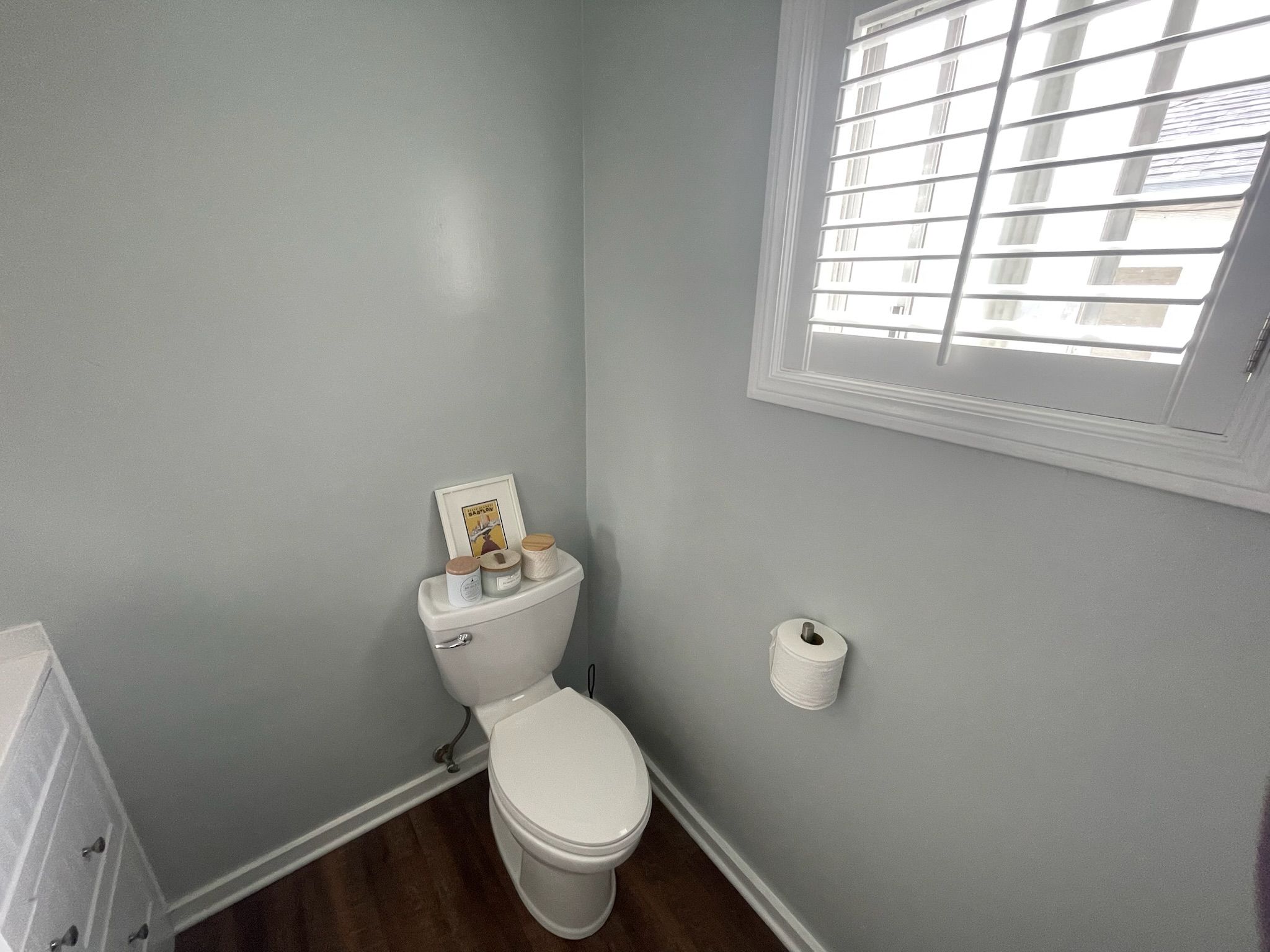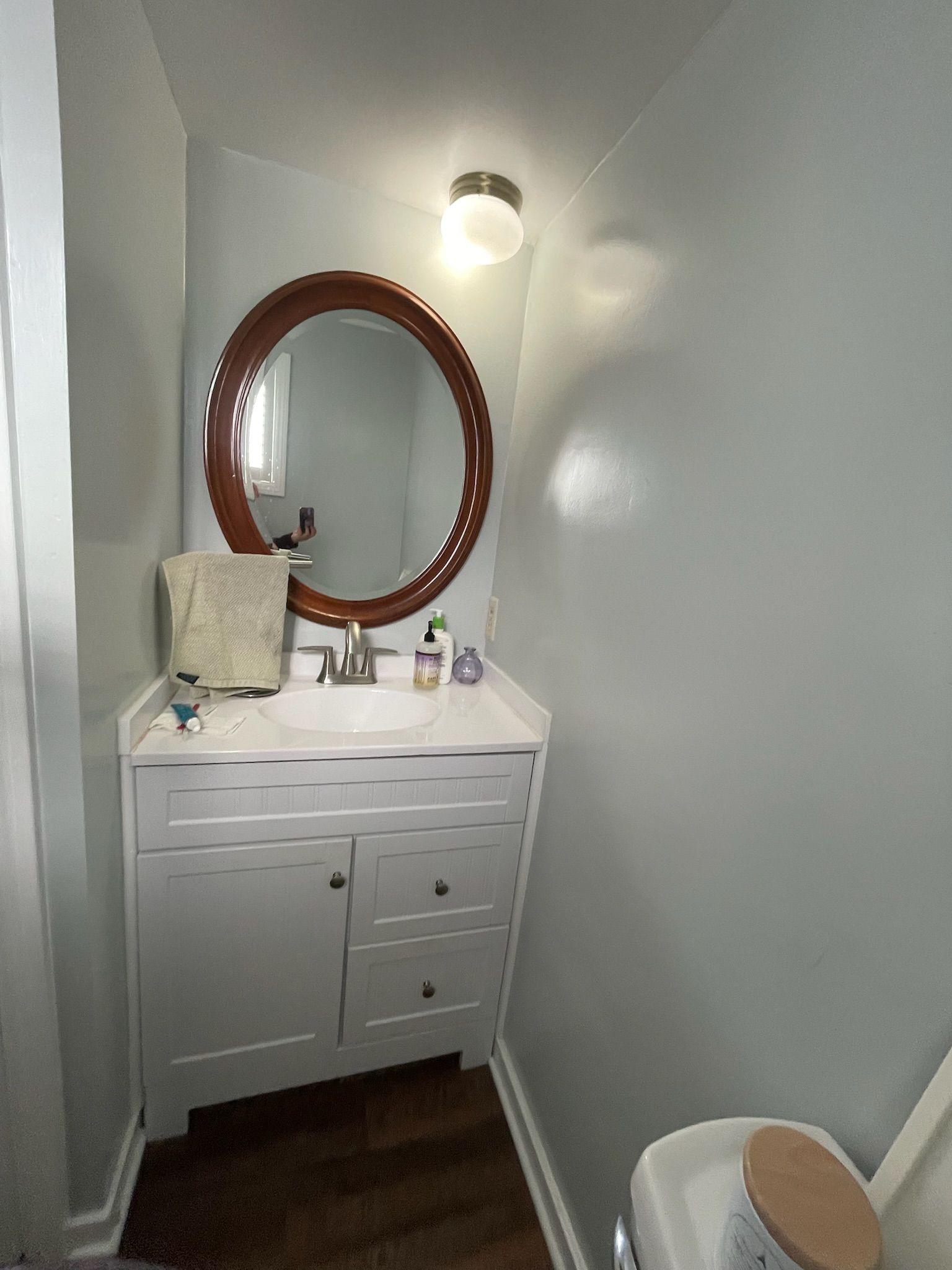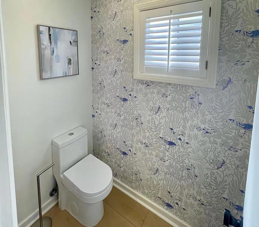- Powder Room: Replaced outlet with GFCI, installed vanity mirror, installed toilet, installed wallpaper, ran new electric line, painted vanity, installed toilet, installed ceiling light, patched drywall.