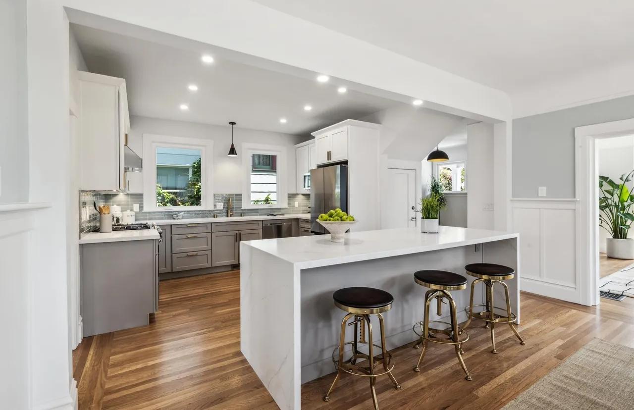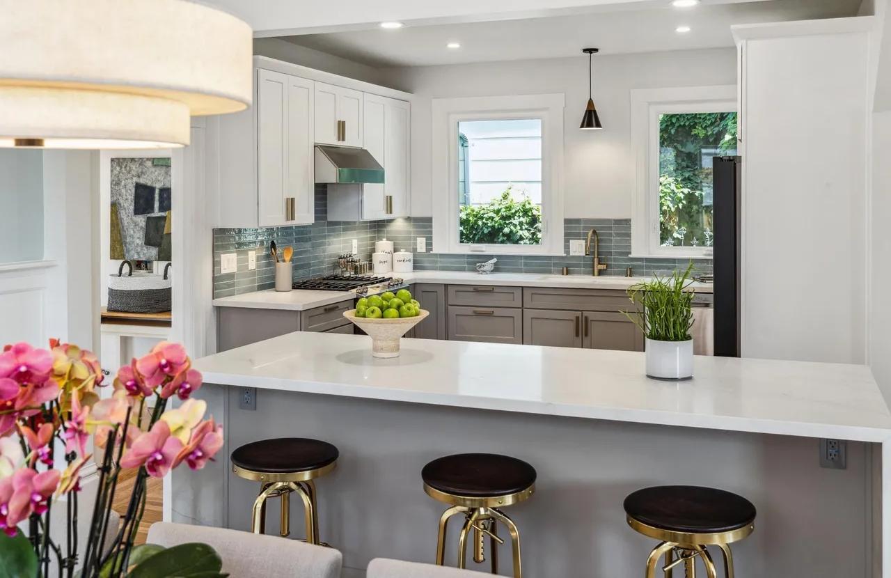 - Kitchen: Installed windows, installed under-cabinet lights for kitchen, installed new GFCI, installed new outlet switch or recessed light, added recessed lights in kitchen and 2 new junction boxes above island, installed cabinets, hardware and island cabinets, installed undermount sink & faucet, installed disposal and air switch, installed countertops, installed backsplash, installed gas range, installed extractor fan, installed microwave, installed refrigerator, installed dishwasher, relocated water, waste drain and gas line for stove, repaired siding at kitchen windows