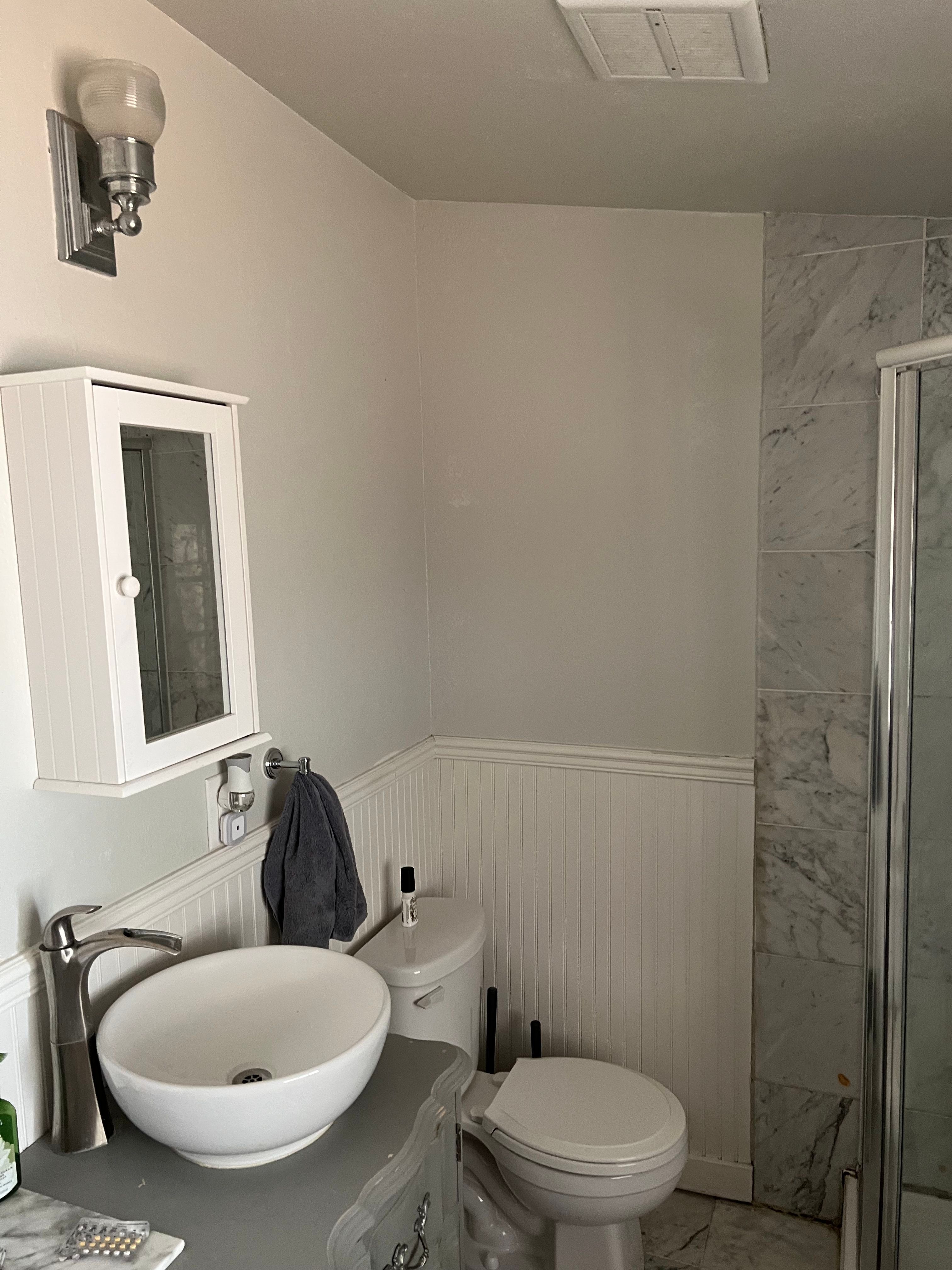 - Main home downstairs en-suite bath: Installed hardiebacker and tile floor, installed new quartz top, installed glass shower enclosure, installed new vanity mirror, installed new toilet, installed new wall mounted hardware, installed wall tile and schluter with nook