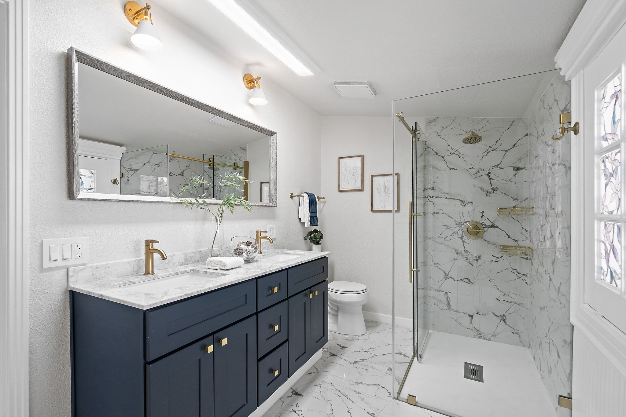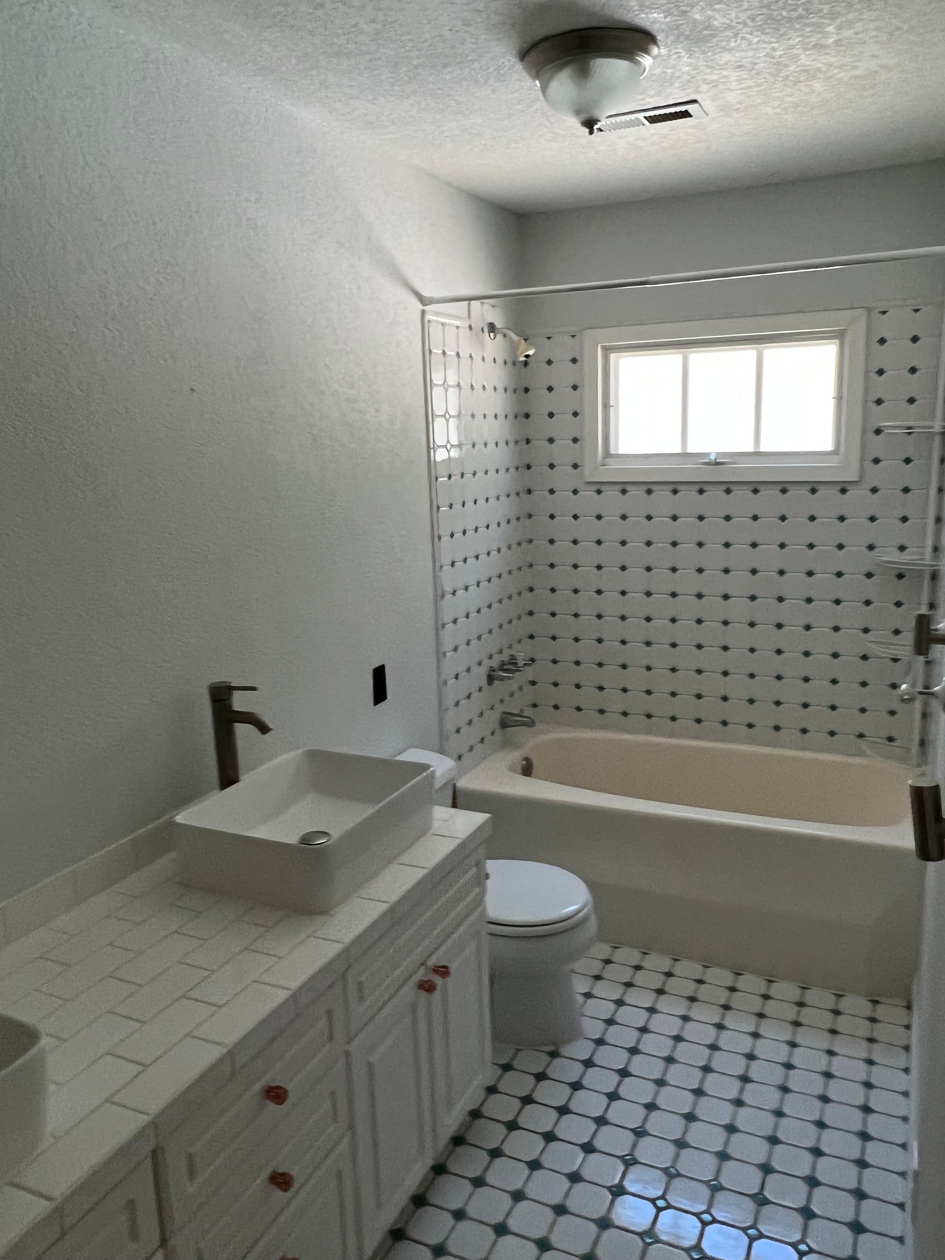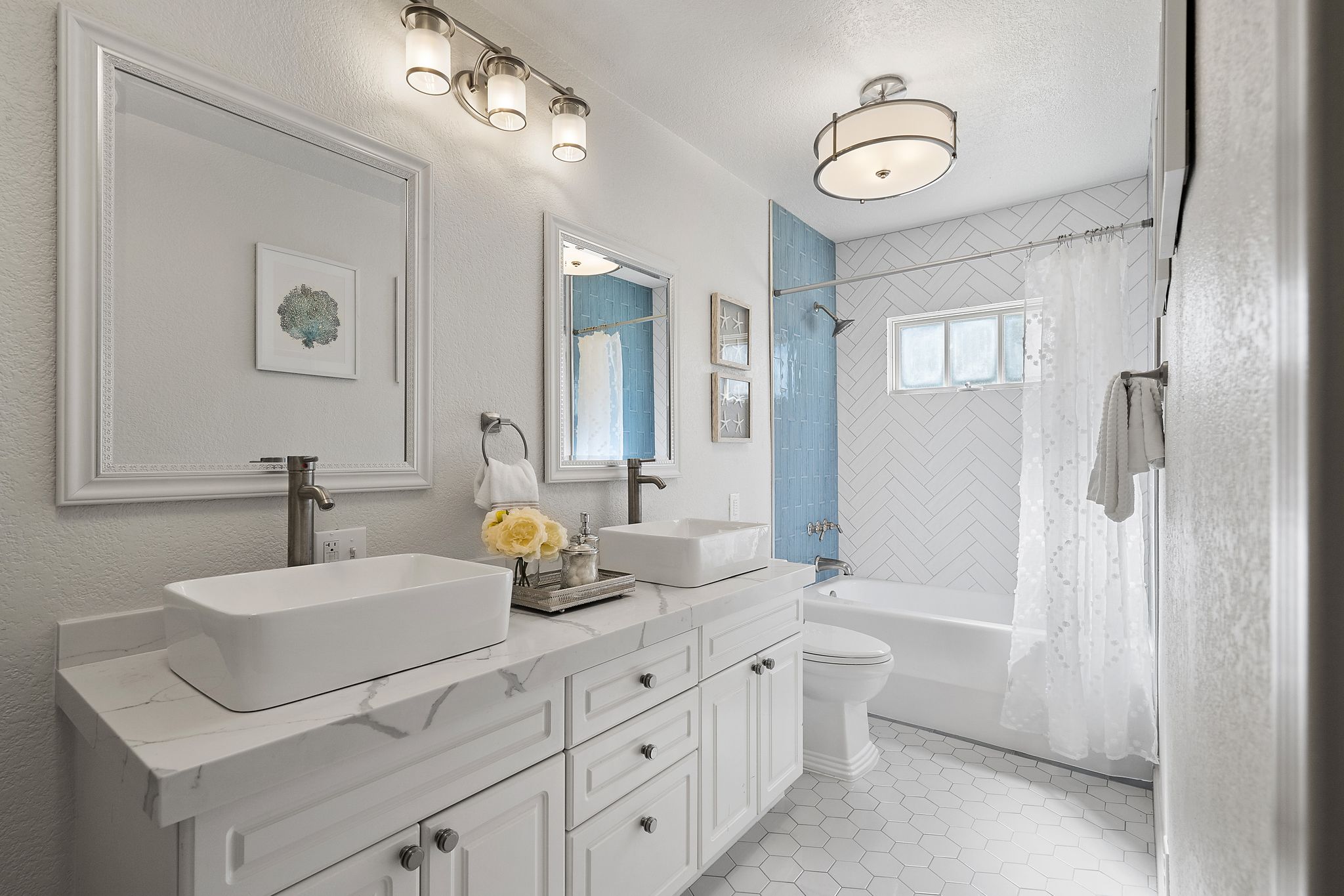 - Main home master bath: Installed hardiebacker and tile floor, installed new sinks and faucets, installed new quartz top, glazed existing tile around tub, installed new vanity mirror, installed new toilet, installed new wall mounted hardware, glazed tile in shower to match tub area, installed new body sprayers and shower head, installed new glass shower enclosure