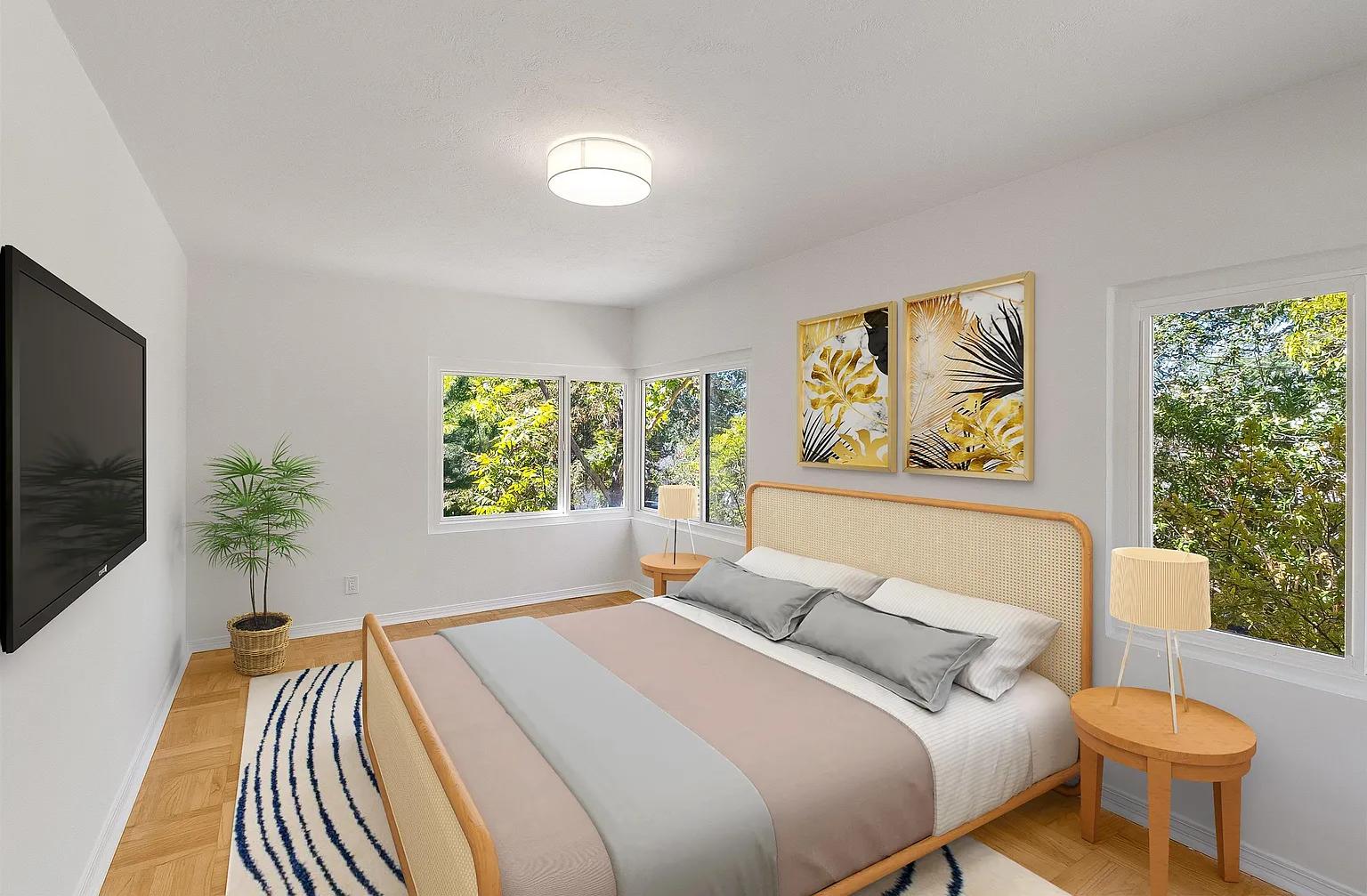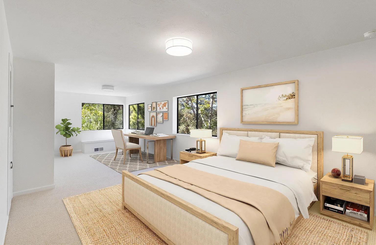- Primary Bathroom: Patched & painted vanity cabinets, installed ceiling fan, installed vanity lights, installed new toilet.