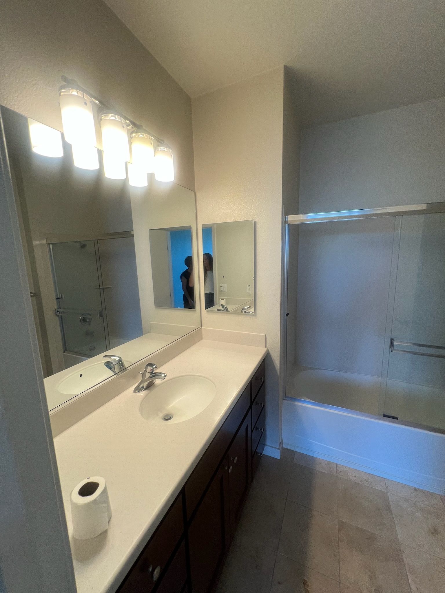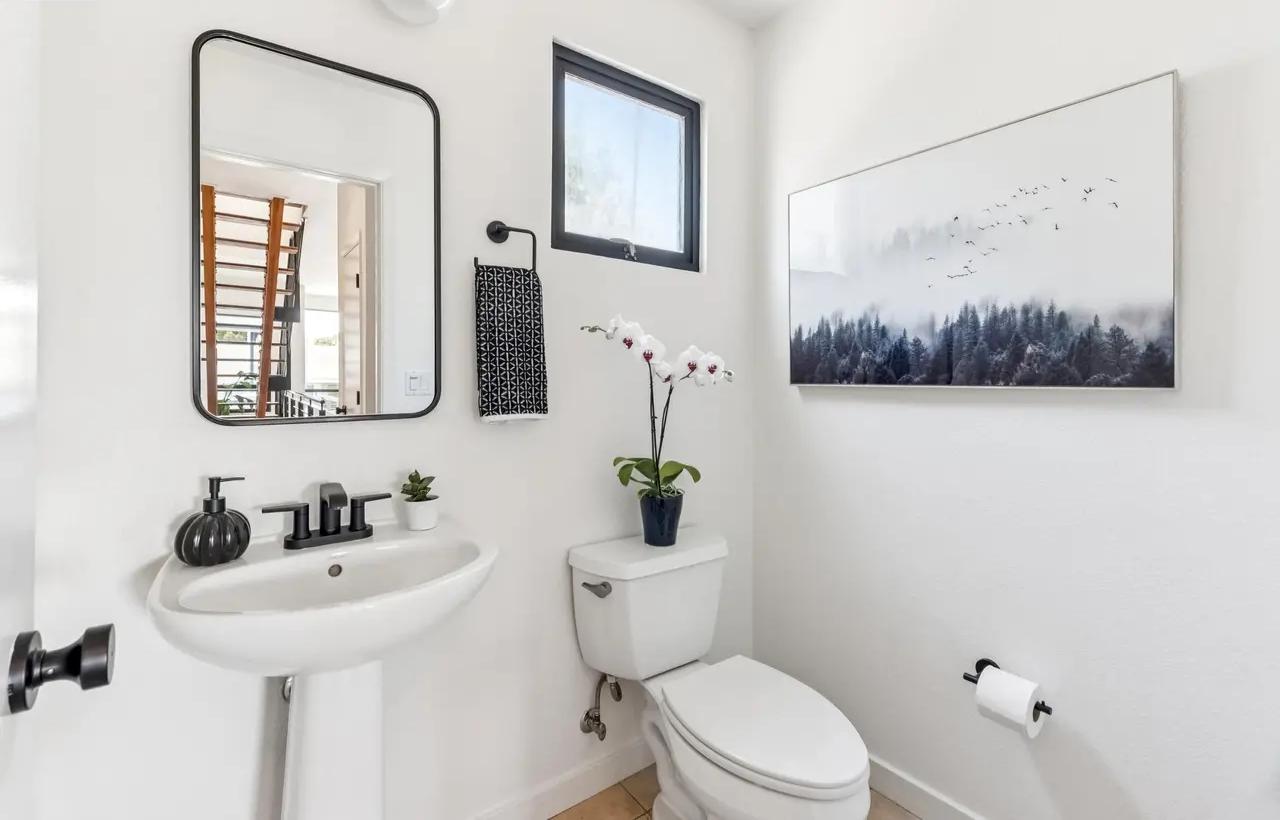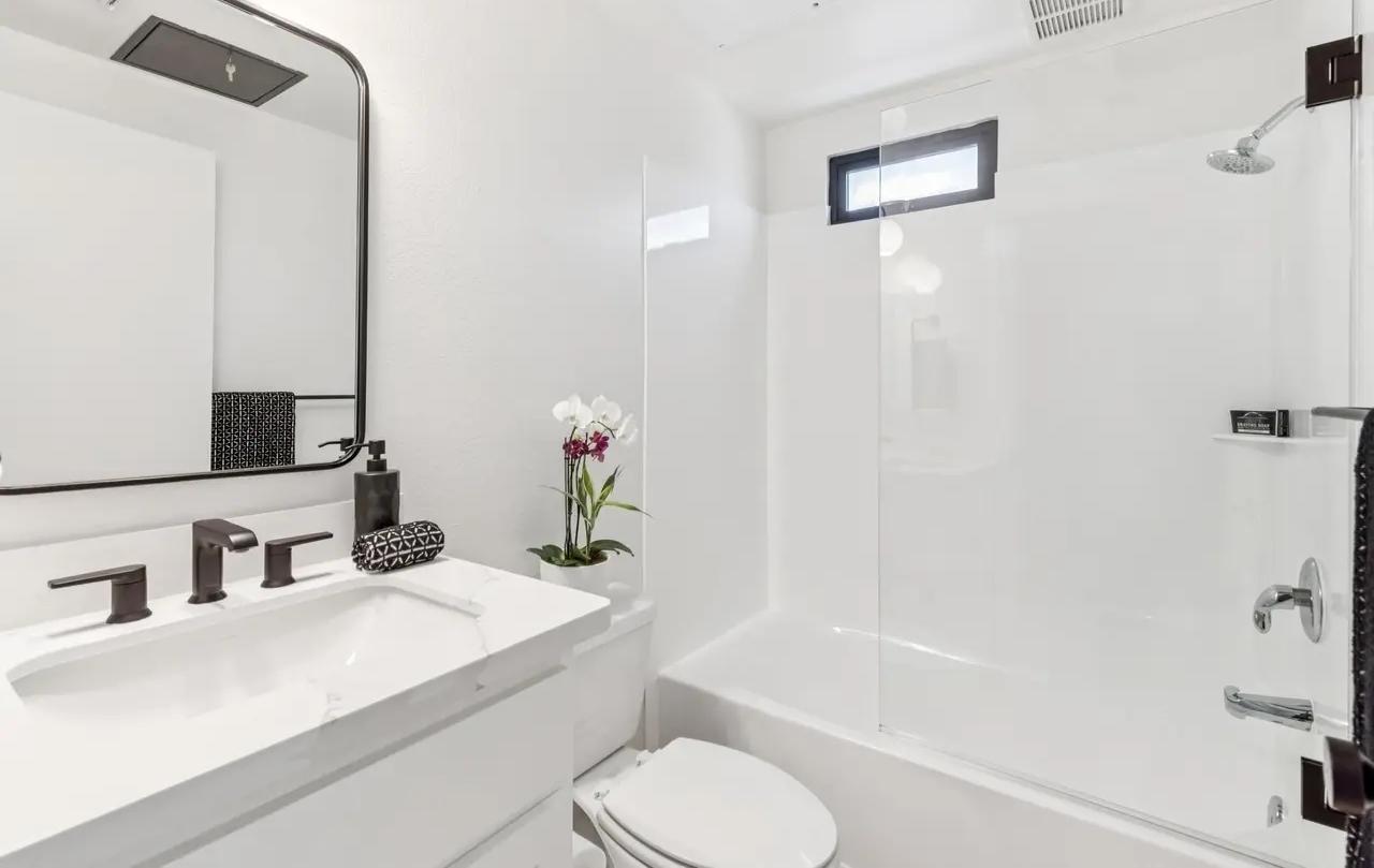 - Full Bath Primary: Replaced vanity lights, installed sink faucet, installed shower head, installed countertop and sink, installed vanity mirror, installed towel bar, towel ring, robe hook & toilet paper holder, installed frameless glass enclosure, refinished tub and shower.
