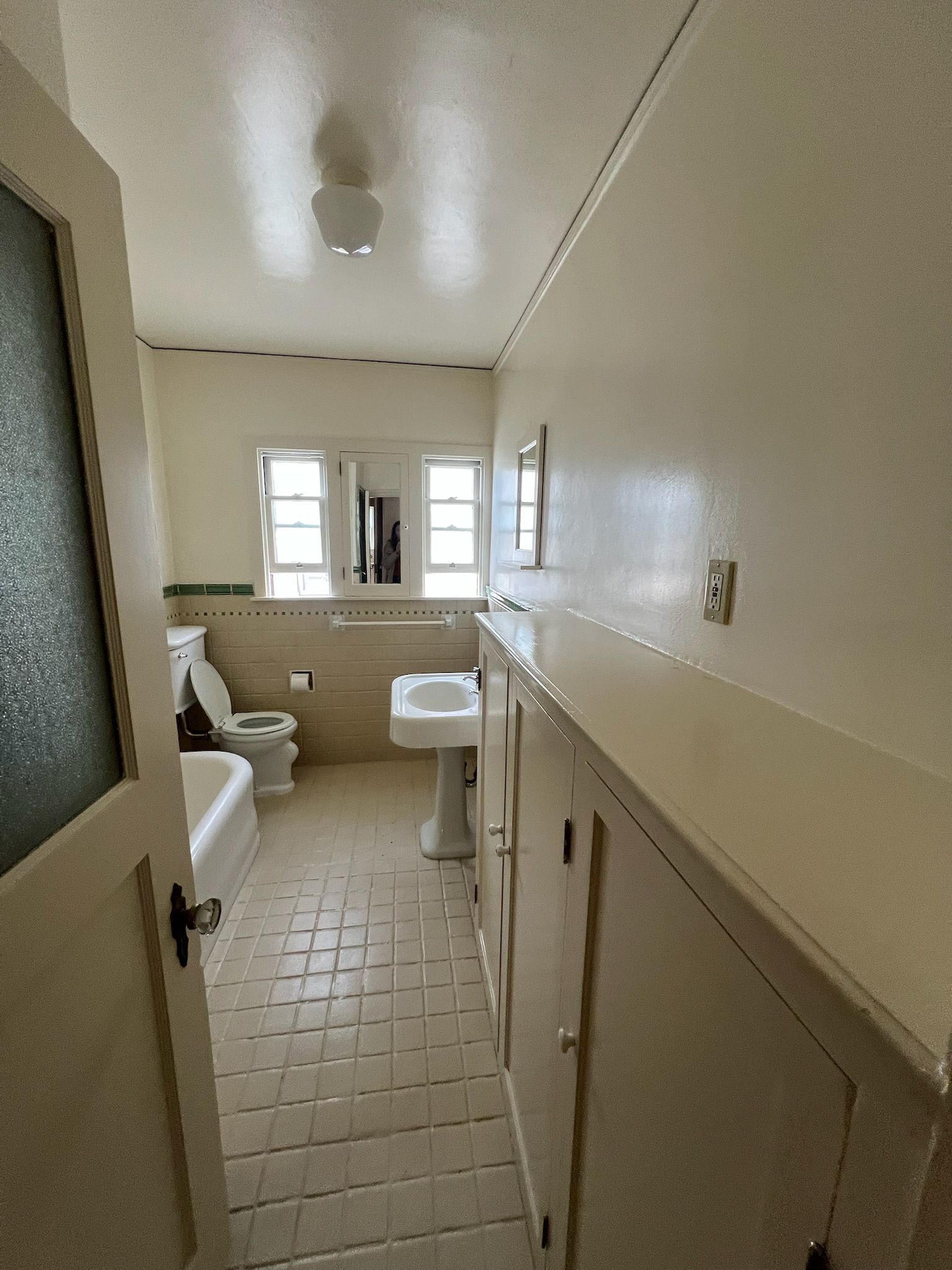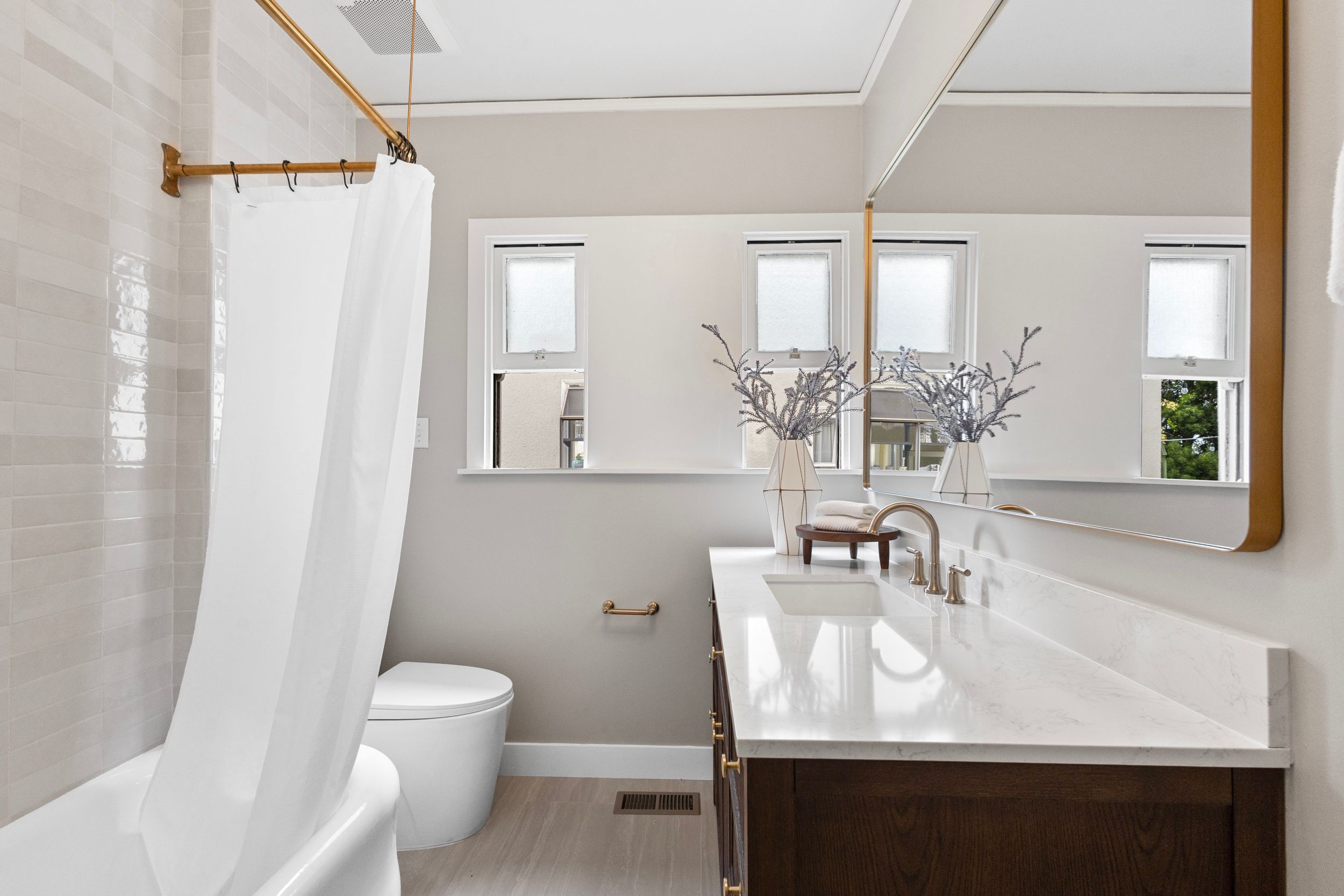 - Upstairs Bathroom: Replaced vanity mirror, refinished shower surround tiles, installed bath accessories, replaced sink faucet, replaced bathroom lights.