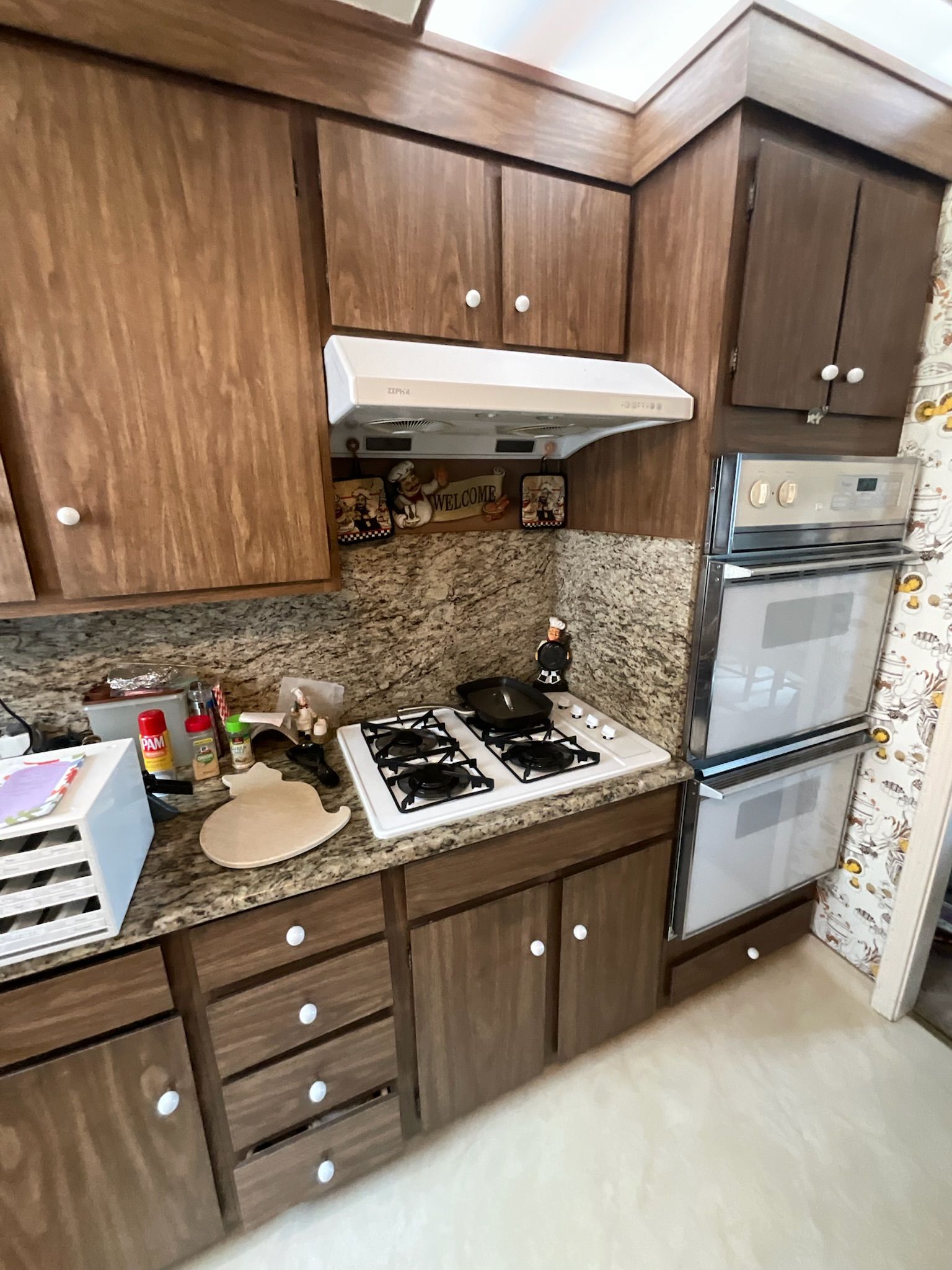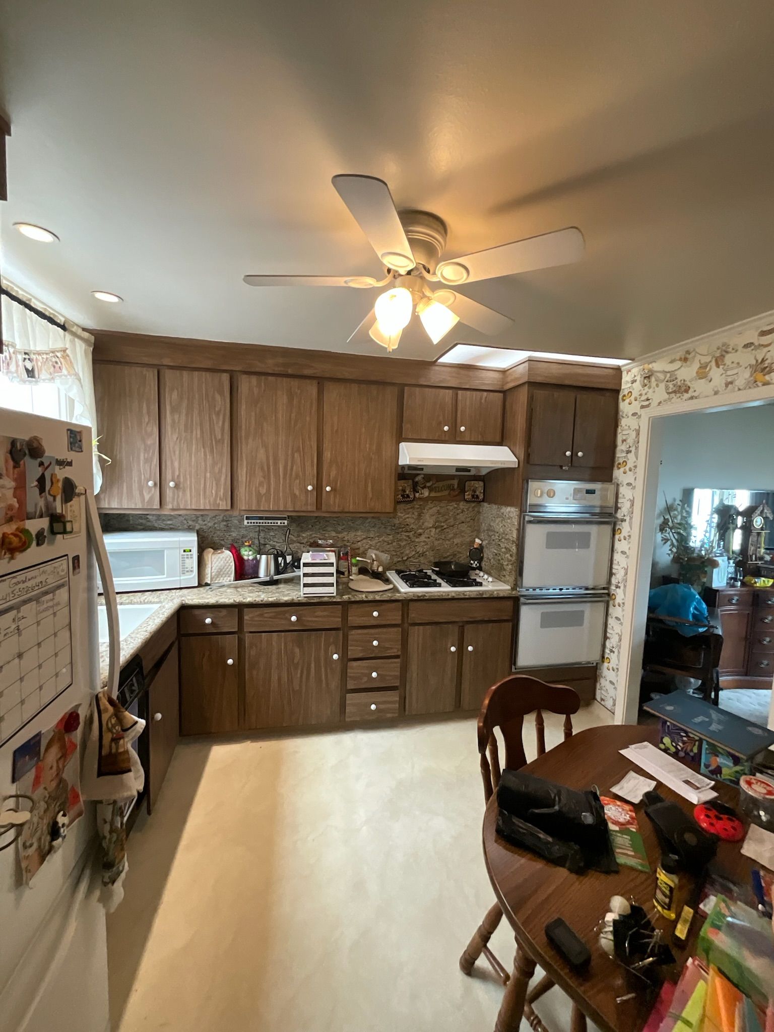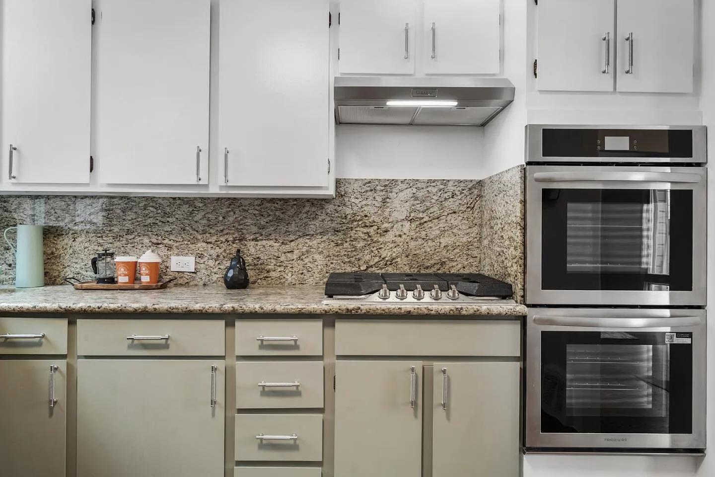 - Kitchen: Installed cabinet hardware, installed refrigerator, range hood, dishwasher, double oven & stovetop, painted cabinets.